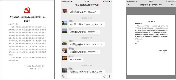 1月23日,醫院黨委、發出《關于做好抗擊新型冠狀病毒肺炎防控工作倡議書》,號召全體共產黨員帶頭奮戰疫情防控第一線。各黨支部積極動員,共產黨員熱烈響應,紛紛遞交請戰書。“我是共產黨員我先上”“我自愿支援武漢,不計生死、不計報酬”“我抗擊過非典我有經驗”……一封封言辭懇切、態度堅決的“硬核”請戰書是一顆顆滾燙的赤子之心!