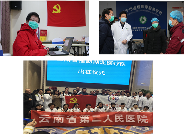 一方有難八方支援,醫院先后組織派出三批醫療隊共40人馳援湖北一線。云南省第一批醫療隊副領隊、云南省醫療隊黨總支副書記鄧毅書是他們中年齡最大的黨員,今年58歲了。接到組建醫療隊的通知,鄧毅書主動請纓:“我是個黨員,剛好又是呼吸科醫生,又有抗擊非典的經驗,這次抗戰疫情,義不容辭要沖在前面!” 在湖北疫情一線,從天蒙蒙亮到夜里12點,鄧毅書的時間總是安排得滿滿的。她每天要先去武漢咸寧及咸寧市所屬的嘉魚、崇陽、赤壁、通山、通城五個縣區的疫情防控指揮部了解當日疫情態勢和防控工作進展;隨后開展密集的巡查,現場查看各個救治點預檢分診、發熱門診及隔離病房的設置、工作流程是否符合要求;隨時動態調整物資及人員;對發熱患者、確診或疑似患者的診療關鍵環節制定規范;為ICU收治的重癥患者進行會診等等。因為太忙,忘記吃飯是常事,她總是隨便扒幾口盒飯,又匆匆趕往下一個點,對她這個年紀的人來說,每天工作到夜里12點已是精疲力竭。在這場特殊的戰“疫”中,勇士們不畏艱險、不怕犧牲,共產黨員甘擔先鋒、沖鋒在前,他們“逆行”的背影成了最美的風景!