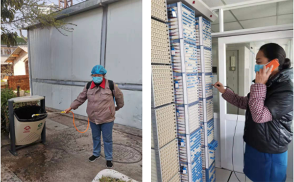 大年三十至今,每天都能看見54歲的蘇衛林身背噴桶認真消毒的身影,她每天工作之余主動加班,一天4遍為各病區、辦公區消毒,從不遺漏一個角落,她最常說的話就是:“我多辛苦一點,大家就更安全一點”。軍隊轉業干部李媛是一名老黨員,家有85歲身患癌癥的母親需要照顧。看到黨委倡議書,她克服困難,帶領總機室職工24小時堅守崗位,每天接聽電話4000-5000個,耳朵真的被磨出繭子了,但她們始終用良好的態度和禮貌的語言給患者傳遞著關懷和溫暖。李媛說,“我是一名共產黨員,應該積極響應組織號召,做好本職工作,為疫情防控盡一份力”。醫院組建了疫情防控志愿服務隊,向民眾發放《新型冠狀病毒感染肺炎預防手冊》,做好科普宣傳,幫助就診患者解決困難,哪里有需要哪里就能看到他們忙碌的身影。