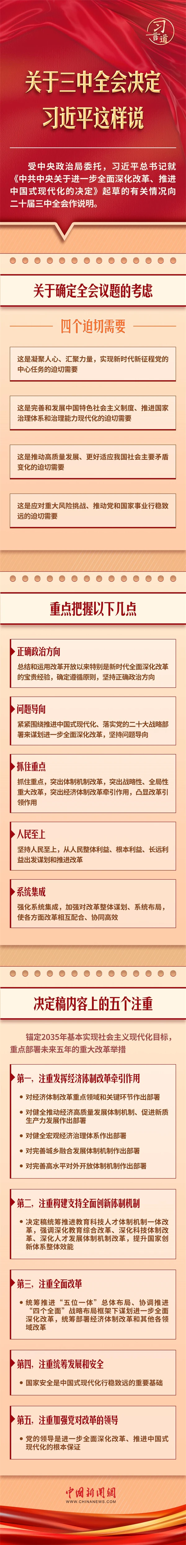 7月21日,二十屆三中全會(huì)審議通過(guò)的《中共中央關(guān)于進(jìn)一步全面深化改革、推進(jìn)中國(guó)式現(xiàn)代化的決定》和習(xí)近平所作的《關(guān)于〈中共中央關(guān)于進(jìn)一步全面深化改革、推進(jìn)中國(guó)式現(xiàn)代化的決定〉的說(shuō)明》全文播發(fā)。