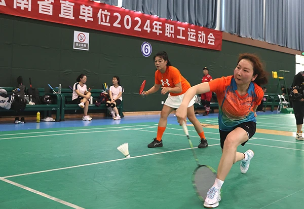 省直單位2024年職工運動會羽毛球女子雙打比賽現(xiàn)場。