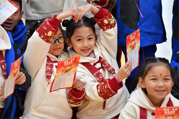在湖南省長沙市天心區的湖南師大附中雙語實驗學校,一年級學生在趣味闖關活動中展示自己的闖關卡片(2024年1月18日攝)。新華社記者 陳澤國 攝