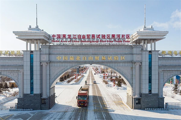 車輛駛出中國(黑龍江)自由貿易試驗區黑河片區大門(2023年2月11日攝,無人機照片)。新華社記者 謝劍飛 攝