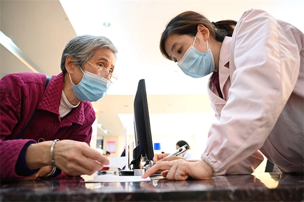 福建省三明市第一醫院醫保辦工作人員(右)向前來咨詢藥品報銷問題的居民講解相關政策(2020年11月18日攝)。新華社記者 姜克紅 攝