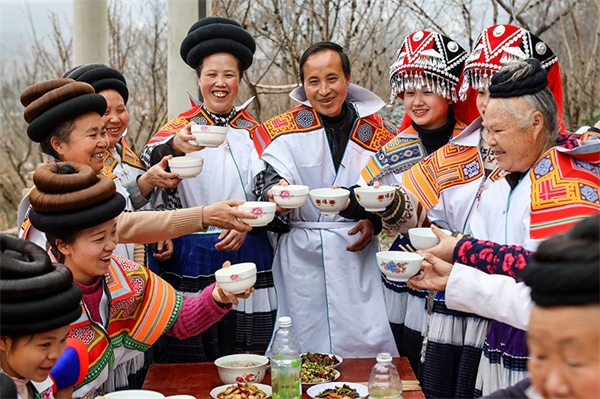 在位于烏蒙山區腹地的貴州省畢節市納雍縣,苗族村民馬雍(右五)與妻子黃國琴(左五)在年夜飯上與大家干杯(2021年2月11日攝)。新華社記者 歐東衢 攝