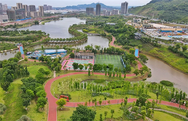 2023年6月1日拍攝的四川瀘州漁子溪濕地公園(無人機照片)。瀘州高新區漁子溪濕地公園的“前身”是三道河、新河溝和大橋河溝,三條支流匯聚于漁子溪湖匯入長江。原流域內生態環境差,污染嚴重,垃圾隨處可見,是典型的城郊“臭水溝”。經過治理,漁子溪湖水質得到根本性改良,部分區域指標達到Ⅰ、Ⅱ類水標準。同時,治理后的漁子溪湖減少了水土流失,降低了直排長江的泥沙含量,達到節約水資源、水土保持和修復生態的目的。“臭水溝”蝶變成為“網紅打卡地”。新華社記者 劉坤 攝