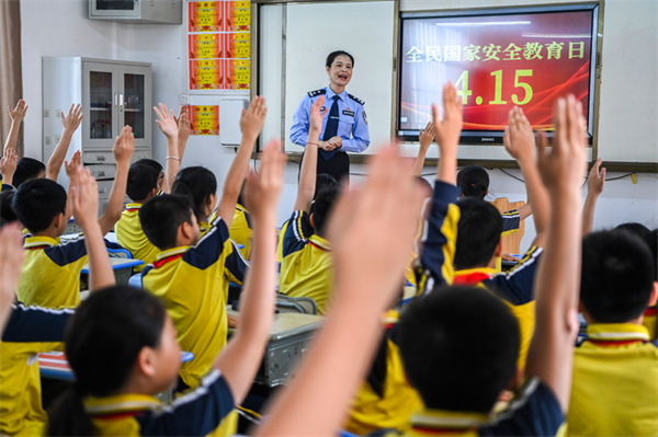 2024年4月15日,在廣西興業縣一所小學內,公安民警在講解國家安全相關知識的過程中與學生們互動。新華社記者 曹祎銘 攝