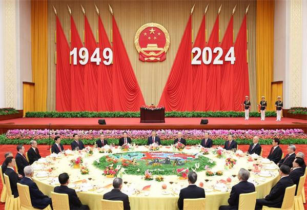 人民大會堂宴會廳華燈璀璨,洋溢著喜慶熱烈的節日氛圍。主席臺上方高懸著莊嚴的國徽,“1949-2024”大字年號在鮮艷紅旗映襯下格外醒目。