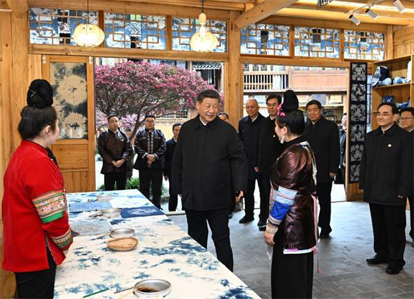 3月17日至18日,中共中央總書記、國家主席、中央軍委主席習(xí)近平在貴州考察。這是17日下午,習(xí)近平在黔東南州黎平縣肇興侗寨侗鄉(xiāng)特色產(chǎn)業(yè)基地考察。新華社記者 謝環(huán)馳 攝