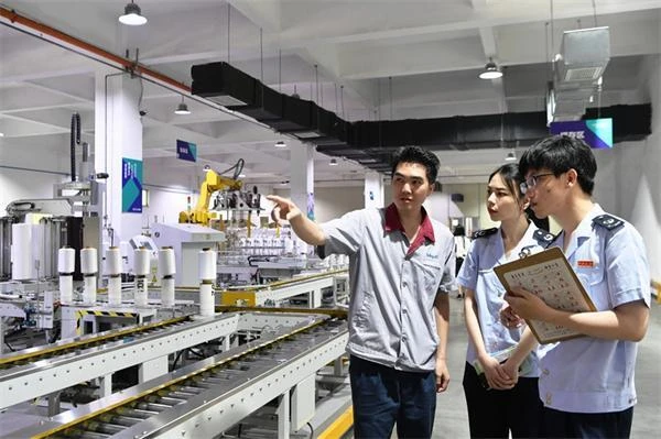 2023年5月31日,在福建省恒申合纖科技有限公司化纖自動(dòng)化包裝車(chē)間,國(guó)家稅務(wù)總局福州市長(zhǎng)樂(lè)區(qū)稅務(wù)局工作人員(中、右)在了解企業(yè)的生產(chǎn)經(jīng)營(yíng)狀況,積極落實(shí)各項(xiàng)減稅降費(fèi)及退稅緩費(fèi)政策。新華社記者 魏培全 攝