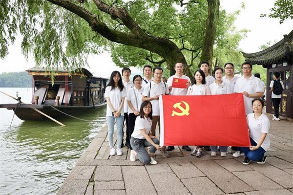 2024年7月1日,在浙江省嘉興市南湖湖心島,黨員們與紅船合影。新華社發(fā)(成杰 攝)